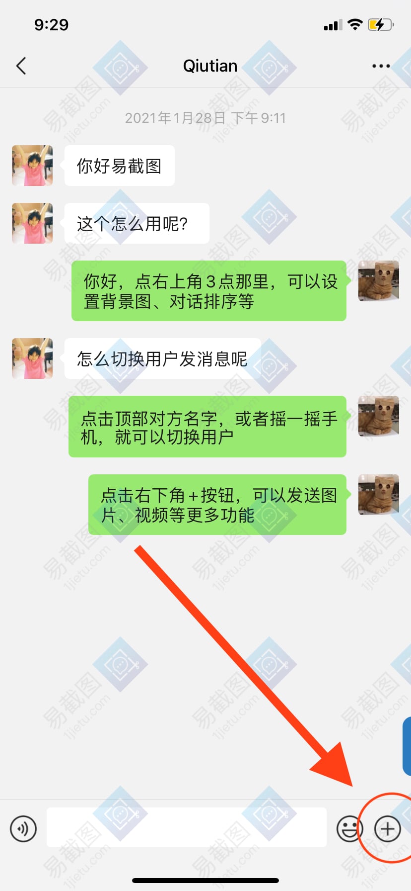 1.在聊天页面右下角点击“+”按钮