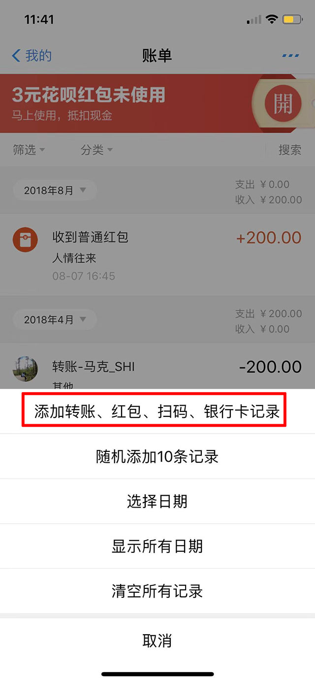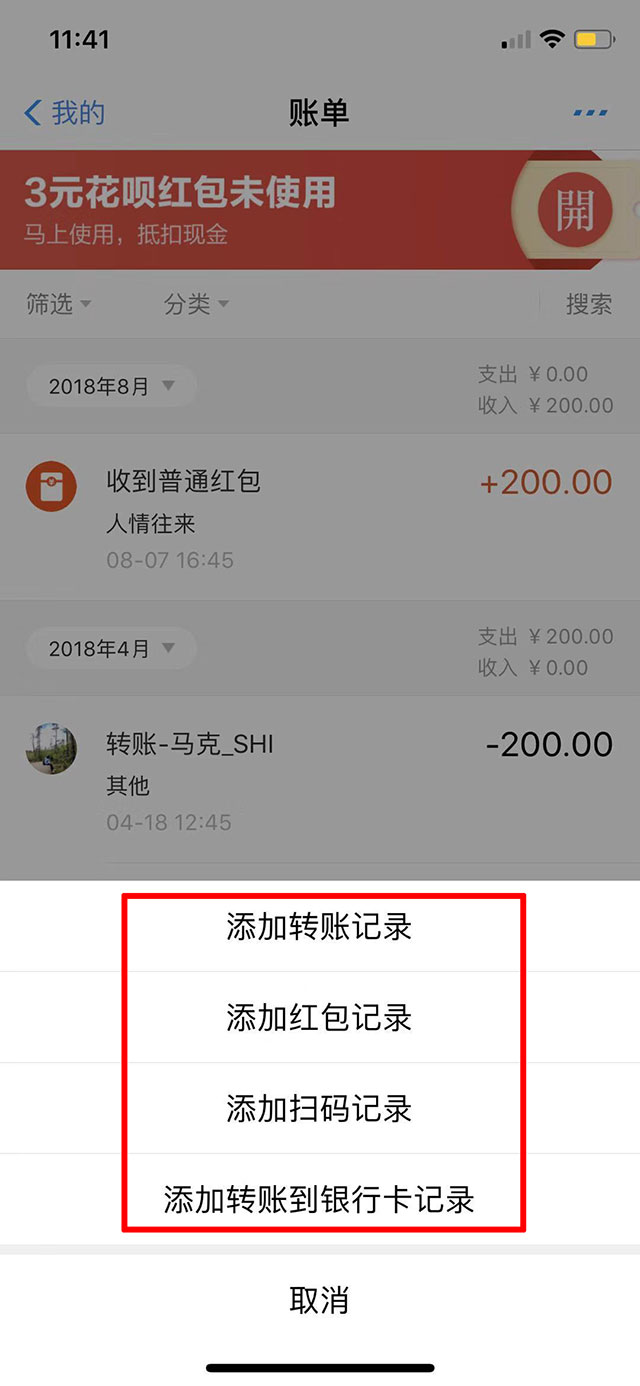 3.在弹出的菜单中选择添加转账、红包、扫码、银行卡记录(或可以随机添加账单记录)