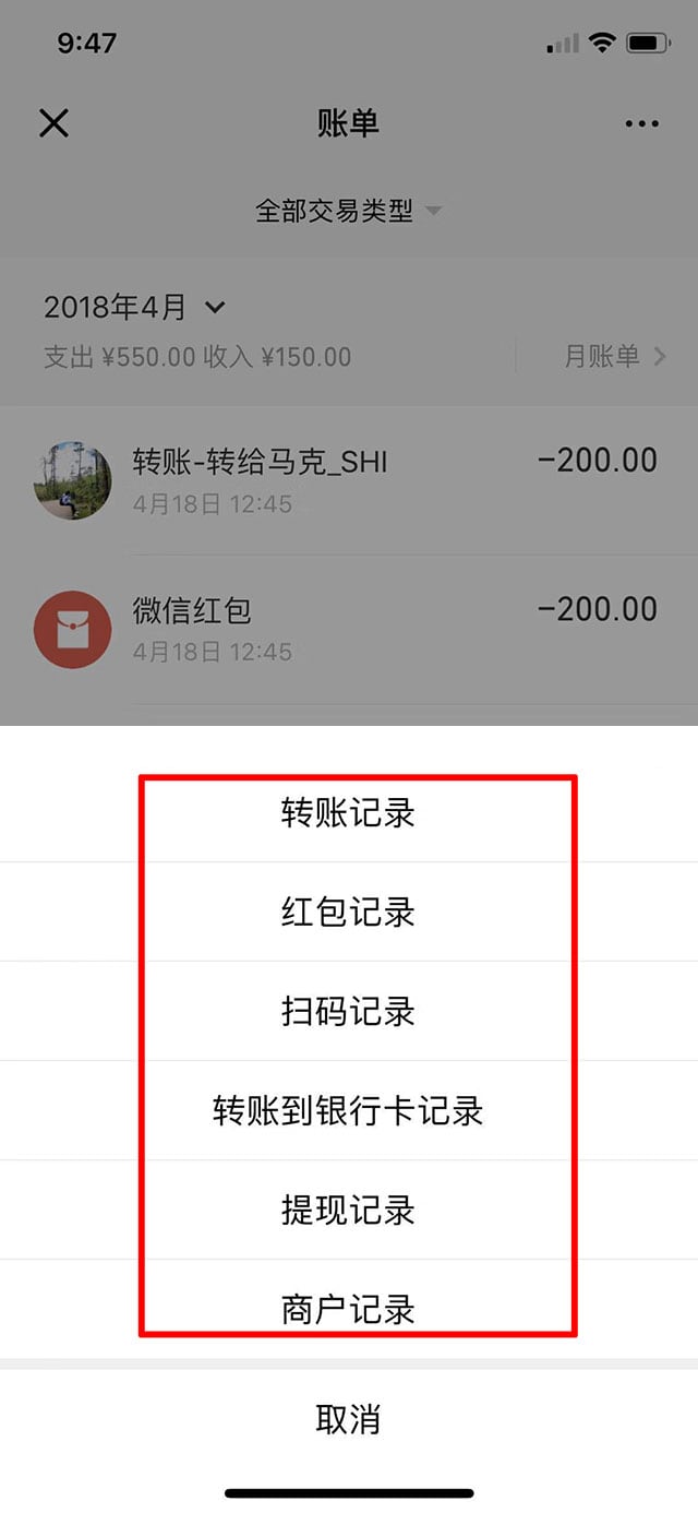 3.然后选择你要添加的记录类型,包括转微信账记录、红包记录、扫码记录、转账到银行卡记录、提现记录、商户记录等